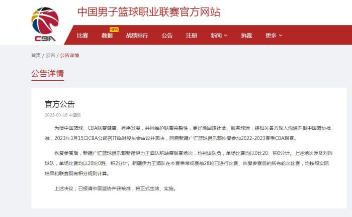 经相关各方协商并获得中国篮协批准,CBA公司召开了一次临时股东会,围绕新疆广汇篮球俱乐部的参赛事务进行了充分讨论和表决。最终决定允许该俱乐部重新回到2022-2023赛季的CBA联赛...