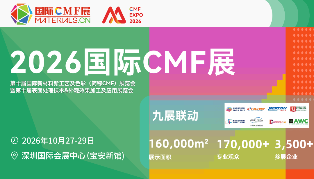 第十届国际新材料新工艺及色彩(简称CMF)展览会将于2026年10月27日至29日在深圳国际会展中心举办,打造以CMF(色彩、材料、工艺)为核心、聚焦材料设计创新与应用的行业盛会,助力产业链协同发展与价值提升。