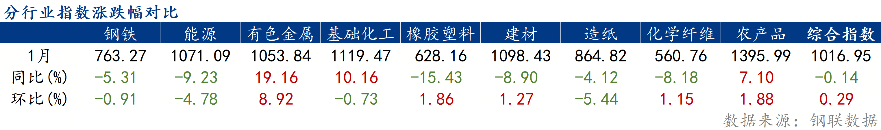 同比来看,1月份有色金属、基础化工、农产品3个行业价格指数上涨,钢铁、能源、橡胶塑料、建材、造纸、化学纤维6个行业价格指数下跌。