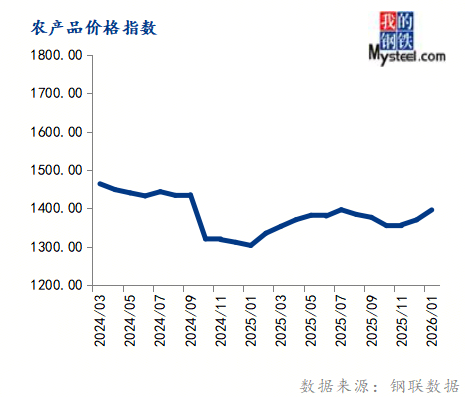 1月份农产品价格指数为1395.99,环比上涨1.88%,同比上涨7.10%。