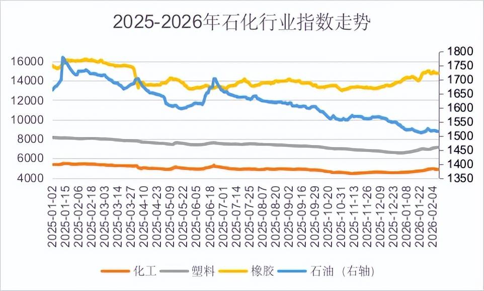 分行业来看,1月份,中东地缘局势紧张对油价起到支撑作用,且哈萨克斯坦与美国石油供应因不可抗力减少的预期支撑国际原油价格整体震荡上行。受原油反弹提振,且汽油需求趋稳向好,成品油批发价格上涨为主,零售价格上调幅度较低。化工行业虽处传统需求淡季,下游部分复苏缓慢,产业链承压,但原油上涨支撑化工市场震荡上涨。国内塑料市场在原油成本推动和进口供应意外收紧预期的双重刺激下,市场迎来一波强势反弹。橡胶市场受大宗商品走强及资金带动,多重利好驱动下市场行情上移。总得来看,石化行业指数整体呈现同比下降,环比上涨走势。
